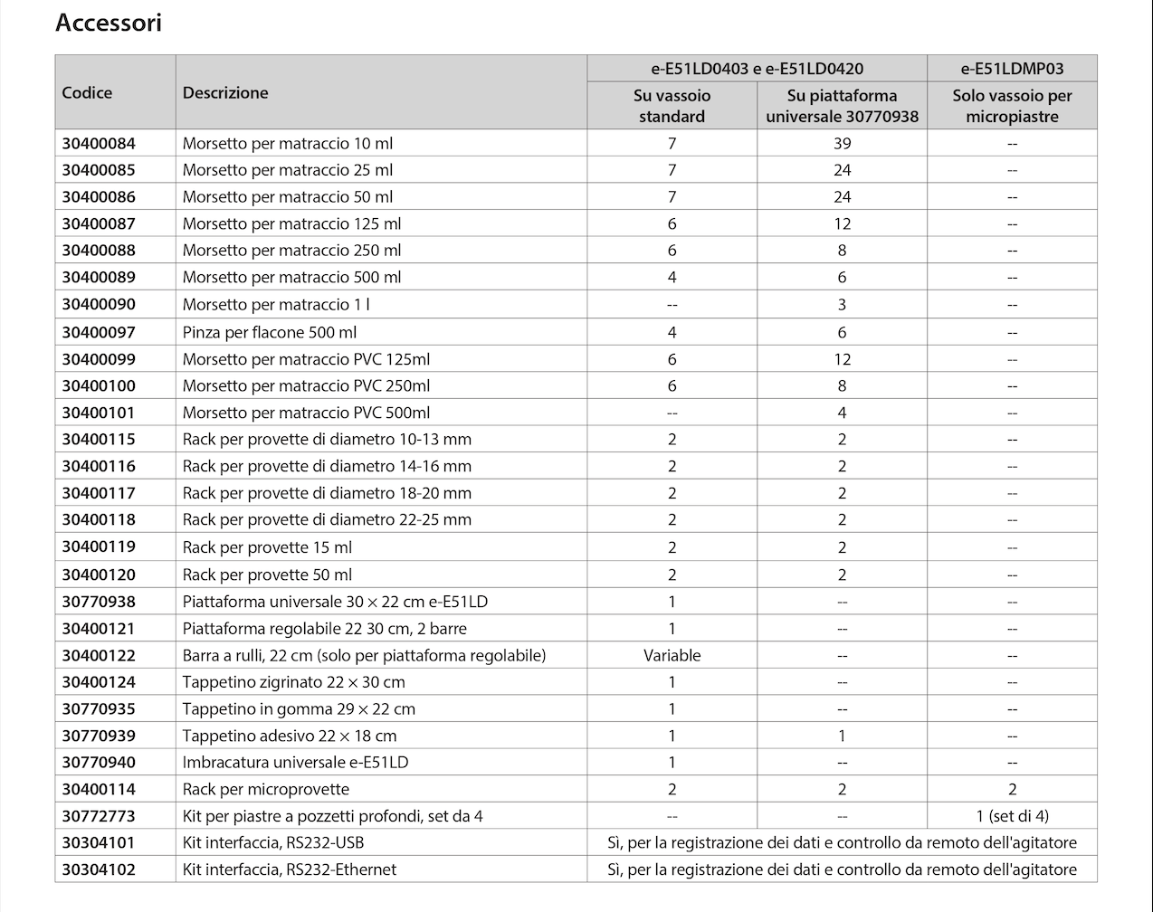 Accessori opzionali: piattaforma universale, oltre 20 pinze per beute e rack per provette. Disponibile anche un modello specifico per micropiastre.