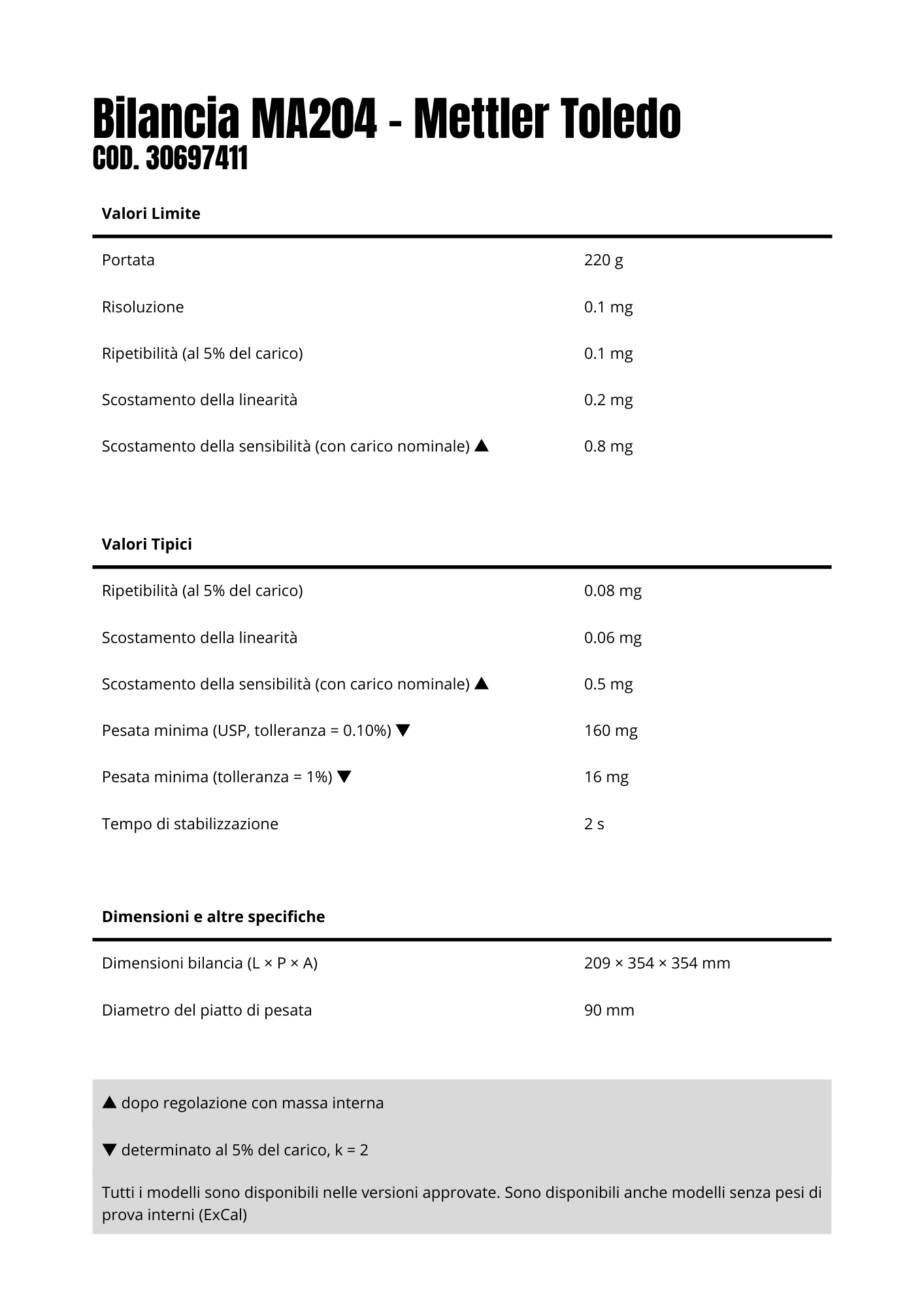 Bilancia di precisione MA204 220g 0,1mg Cal. Interna METTLER TOLEDO