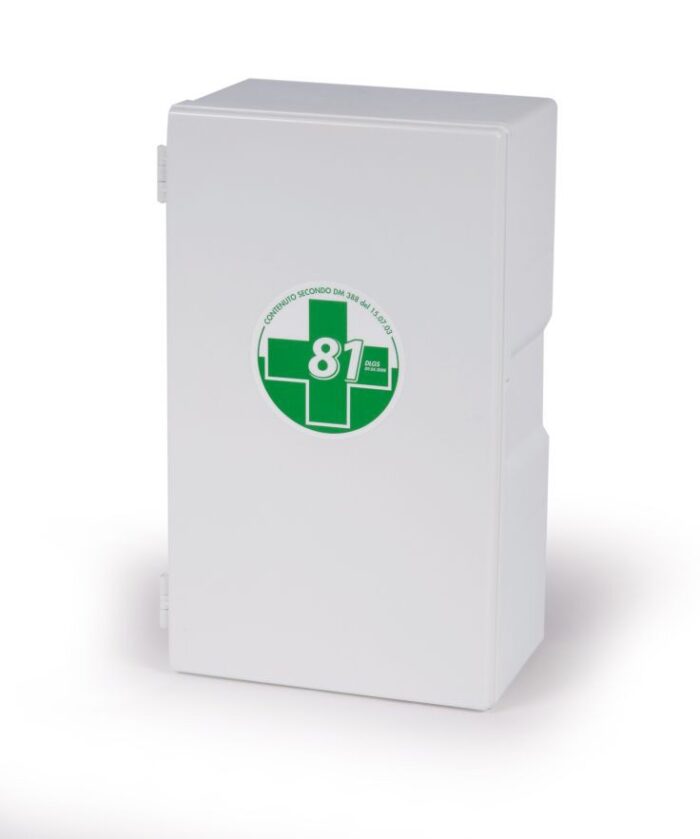 Armadietto in RC colore bianco, 3 vani, 2 ripiani interni,chiusura a scatto. Contenuto a norma del DM 388 del 15/07/2003 allegato 2 e D.L. 81 del 09/04/08 art. 45. Per aziende o unità produttive con meno di tre lavoratori che non rientrano nel gruppo A. L'art. 2 punto 5 del DM 388 del 15.7.2003 prevede che il contenuto di cui all'allegato 2 deve essere fornito ai lavoratori che operano in luoghi diversi dalla sede aziendale o unità produttiva. Contenuto:1 copia del Decreto Min 388 del 15.07.03; 2 paia di guanti sterili;1 flacone di disinfettante da 125 ml: IODOPOVIDONE 10% iodio PMC;1 soluzione fisiologica sterile da 250 ml CE;1 busta con compressa di garza sterile da 18×40 cm;3 buste con compressa di garza sterile da 10×10 cm;2 confezioni di cotone idrofilo;1 pinza sterile;1 confezione da 10 cerotti assortit, Plastosan; 1 rocchetto di cerotto adesivo da 5 metri, altezza di 2,5 cm;1 benda di garza da 3,5 metri, altezza 10 cm;1 paio di forbici tagliabendaggi da 14,5 cm, DIN 58279;1 laccio emostatico;1 “ice pack”, ghiaccio istantaneo monouso;1 sacchetto per rifiuti sanitari da 250x350mm;1 copia di istruzioni, multilingua, di pronto soccorso.