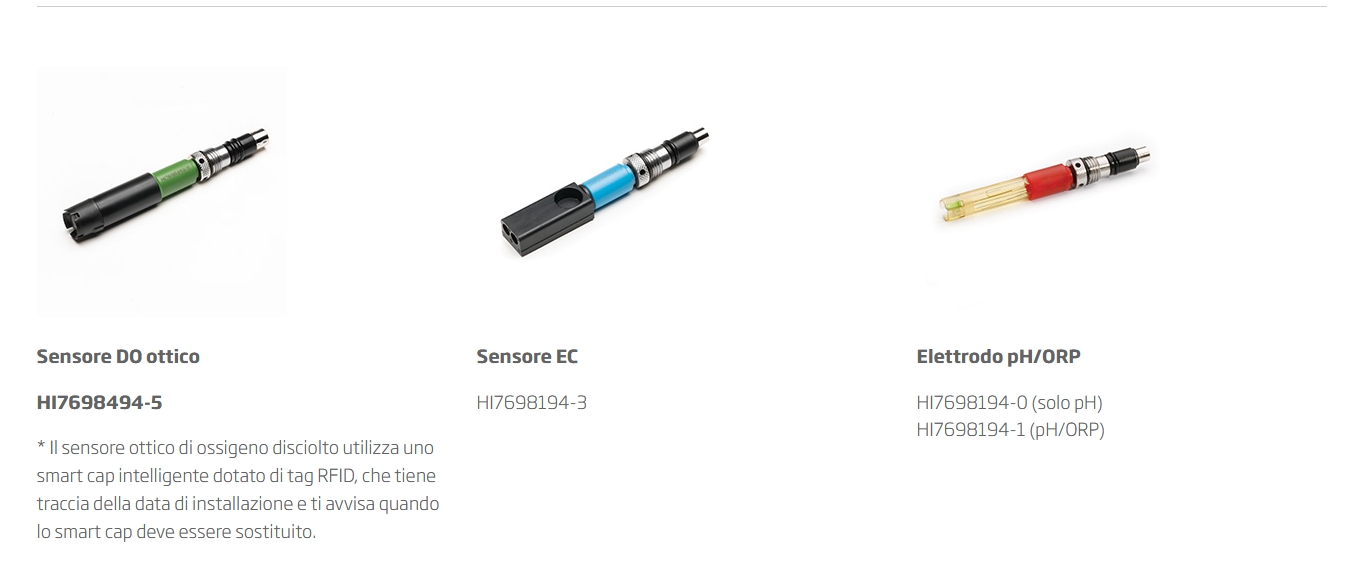 Sonda digitale intelligenteConnessione rapida e cavo unicoLa sonda è dotata di un unico cavo. Inoltre il connettore Quick-DIN rende semplice il collegamento e la rimozione della sonda. Il rivestimento in gomma protegge il cavo e fornisce una tenuta stagna senza torsioni. Sonda digitaleSonda digitale con sensore di temperatura integrato e tre porte per sensori di pH (ORP), EC e DO ottici. Una volta connesso, lo strumento riconosce automaticamente i sensori. SensoriLa sostituzione del sensore è rapida e semplice da eseguire, anche sul campo. I sensori sono codificati a colori per una facile identificazione. |
