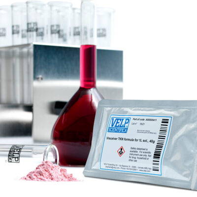 Durante il processo di distillazione Kjeldahl, il contenuto di ammoniaca viene condensato e raccolto in una soluzione di acido borico per evitare la perdita di NH3 gassoso. Vreceiver™ è una formula certificata composta da polvere di acido borico e da una miscela di indicatori menzionati dai metodi AOAC (verde Bromocresolo e rosso metile) che consente una preparazione rapida e standardizzata della soluzione ricevente per la titolazione colorimetrica.